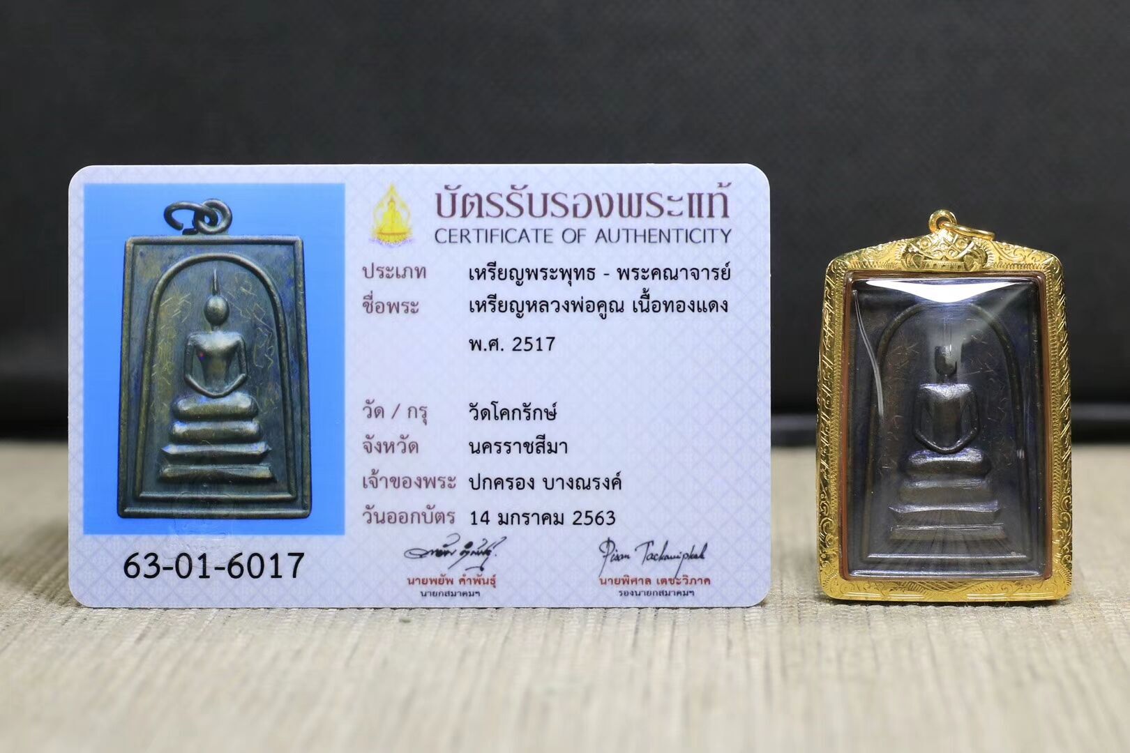 本尊龙婆坤佛历2517崇迪迪佛牌,是坤师傅崇迪种类圣物极为早期的一款佛宝,寺庙圣铜料,以佛历2559年来计算,距今已有42年的历史了。这款崇迪的设计较为周正,典型的三层法座,底座的样式在佛历2500至佛历2520时期被很多高僧使用,整体设计是标准崇迪样式,师傅们多在材料及背面的符文上面进行区分。龙婆坤这期崇迪就正面来讲跟其佛历2516的崇迪有点近似,背面的符文2516款是三角形符文组合,而这期2517的则是正方形符文组合,且底下有部分文字介绍及制作年份的标注。两种符文也在师傅后来的佛牌制作中多次使用过。佛历2517这款崇迪的正面崇迪两边有龙婆坤亲自手刻的符文,早期圣物制作龙婆坤都是做到最好,不惜力地去加持,后来名声大了法会邀请很多,本庙佛牌制作也很多,所以很难做到佛牌大量地亲自手刻符了。佛历2517这期的崇迪基本都得到了师傅手刻符的额外加持,不过数量其实也是非常少量的,否则师傅也真心没那个时间和精力去每尊刻符。诸多的优势也让佛历2517这期崇迪受到了市场的重视,虽然不可说一牌难求,但是不好找也是实际的情况。