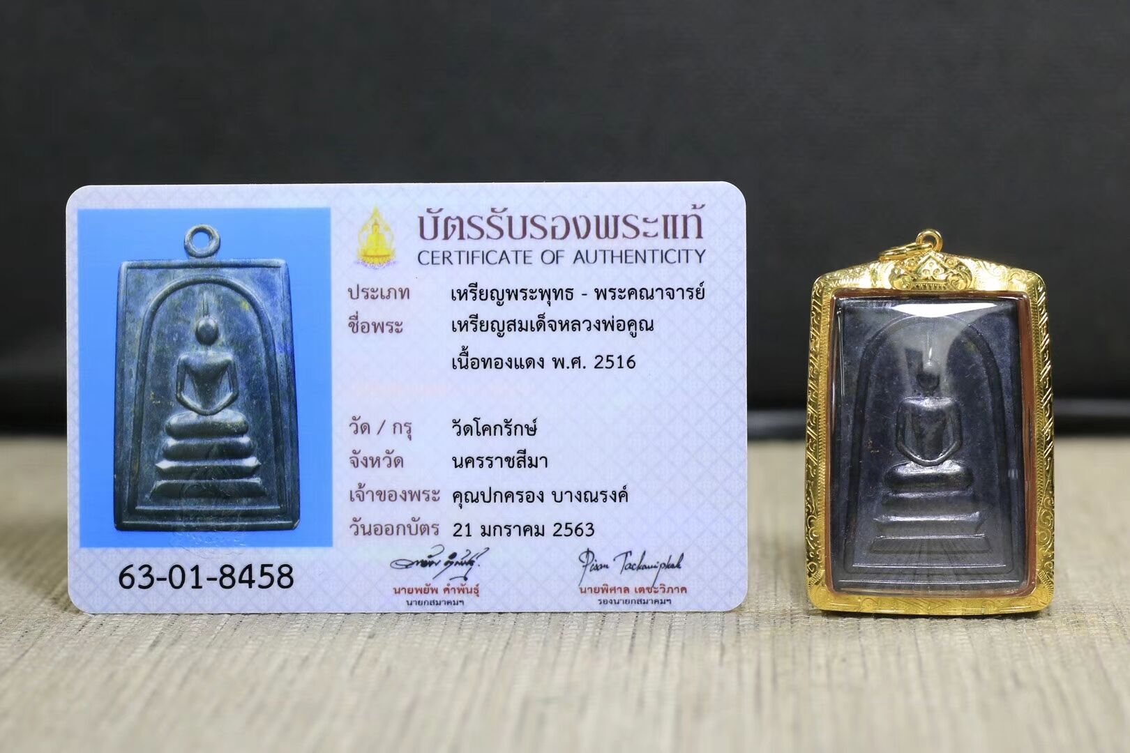 龙婆坤师傅的生平: 师傅生于佛历2466年10月4日,相传龙婆坤的母亲在怀有龙婆坤时,由天神托梦。主要是父亲与母亲这对夫妻一直从善积德,所以天神决定赠给母亲一粒水晶球,说明了这个宝物将来会是佛门的至宝。于是十月怀胎诞下了龙婆坤师傅,让其广传佛法、普度众生造福。 龙婆坤生活在家庭富足的环境,7岁时就跟随多名有名的阿赞学习佛法。21岁开始学习僧侣的信条和守则。随后跟随龙婆锭学习佛法、打坐、和一些基本的修法。后由另外一位恩师龙婆公指导。进行了自己的西瓦里式苦行修炼,独步前往泰国边疆、柬埔寨等地的高山、原野去打坐、禅悟,努力提升自己的境界,这样的修行至少持续了10年的时间。 大师在世时,有不少泰国人相信并传诵,他仙逝后,就会成仙成佛。姑勿论传闻的可信性有多高,但是每天有不少泰国人,从四方八面来到高僧所在的瓦班莱佛寺,等上一天时间,只希望能够让高僧「扑」一下头,得以改运。如果有幸能够得他「吐一啖口水」,那就更加了不得。事实上,要得到龙婆坤大师亲自接见,非得褔缘深厚的人不可,纵能与他见面,也不一定有机会得到他的加持。在众多跪拜的善信中,大师会每半小时手持一支木棒,走在善信前扑头,这就是扑头和尚名称的来由。 坤爷早期金属崇迪,2516、2517双版本全收录,小圆满! 寺庙圣铜材质,牌身布满师傅亲手刻画的符文,针对各方提升